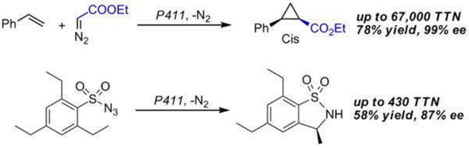 有研究找到了全新的亞鐵血紅素酶催化反應(yīng)類型。由弗朗西斯·阿諾德、佩德羅·科埃略和他們的同事們發(fā)表在Science的一篇文章揭露了這個驚人的發(fā)現(xiàn),P450工程酶可以通過卡賓轉(zhuǎn)移至烯烴而催化環(huán)丙烷化反應(yīng)。以重氮作為卡賓的前體,不少的亞鐵血紅素酶可以將烯烴(如苯乙烯)轉(zhuǎn)化為手性環(huán)丙烷。在重氮乙酸乙酯和苯乙烯反應(yīng)的過程中,不同的酶能產(chǎn)生不同程度的立體結(jié)構(gòu)選擇性。通過巨大芽孢桿菌中的細(xì)胞色素P450酶進(jìn)一步研究發(fā)現(xiàn),通過對酶的關(guān)鍵結(jié)構(gòu)的突變提高了反應(yīng)的產(chǎn)率和立體選擇性。苯乙烯上的取代基團可以有多種可能,甚至1-甲基苯乙烯也能夠被酶接受。