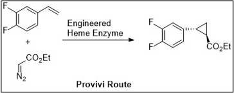 Provivi已經研究了亞鐵血紅素酶能夠催化卡賓轉移反應來生產手性環(huán)丙烷。一個與加州理工學院Frances Arnold實驗室合作的項目結果顯示一種新的、高效的用于手性環(huán)丙烷形成的立體選擇酶。這研發(fā)案例所創(chuàng)造的是一個在自然界中原來不存在的酶催化化學反應。