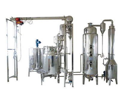 濃縮:提取罐內(nèi)的溶媒加熱至沸騰30-50分鐘關(guān)停電加熱器,強制循環(huán)泵繼續(xù)強制循環(huán),使溶媒溫度降至90度時開啟真空泵進行濃縮,濃縮時產(chǎn)生的蒸氣經(jīng)冷凝器變成水進入浦集器,此時關(guān)停循環(huán)泵繼續(xù)濃縮至所需濃度時放出濃縮液進行第二次提取濃縮。